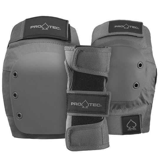 Our general purpose adult knee, elbow and wrist pads. The Protec Street Adult Pads 3 Pack in Grey are made with high quality nylon shells, tough plastic slider and thick elastic straps to ensure a perfect fit, these pads are ready to protect you from whatever you’re throwing yourself at! Open back knee, elbow & wrist guards included.
